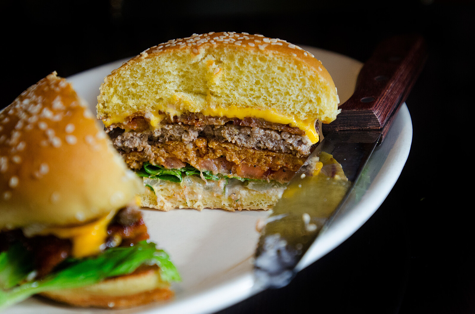 Beef patty and hot sausage patty topped with applewood bacon and Swiss. Topped with creole dressing, lettuce, tomato, and pickles.