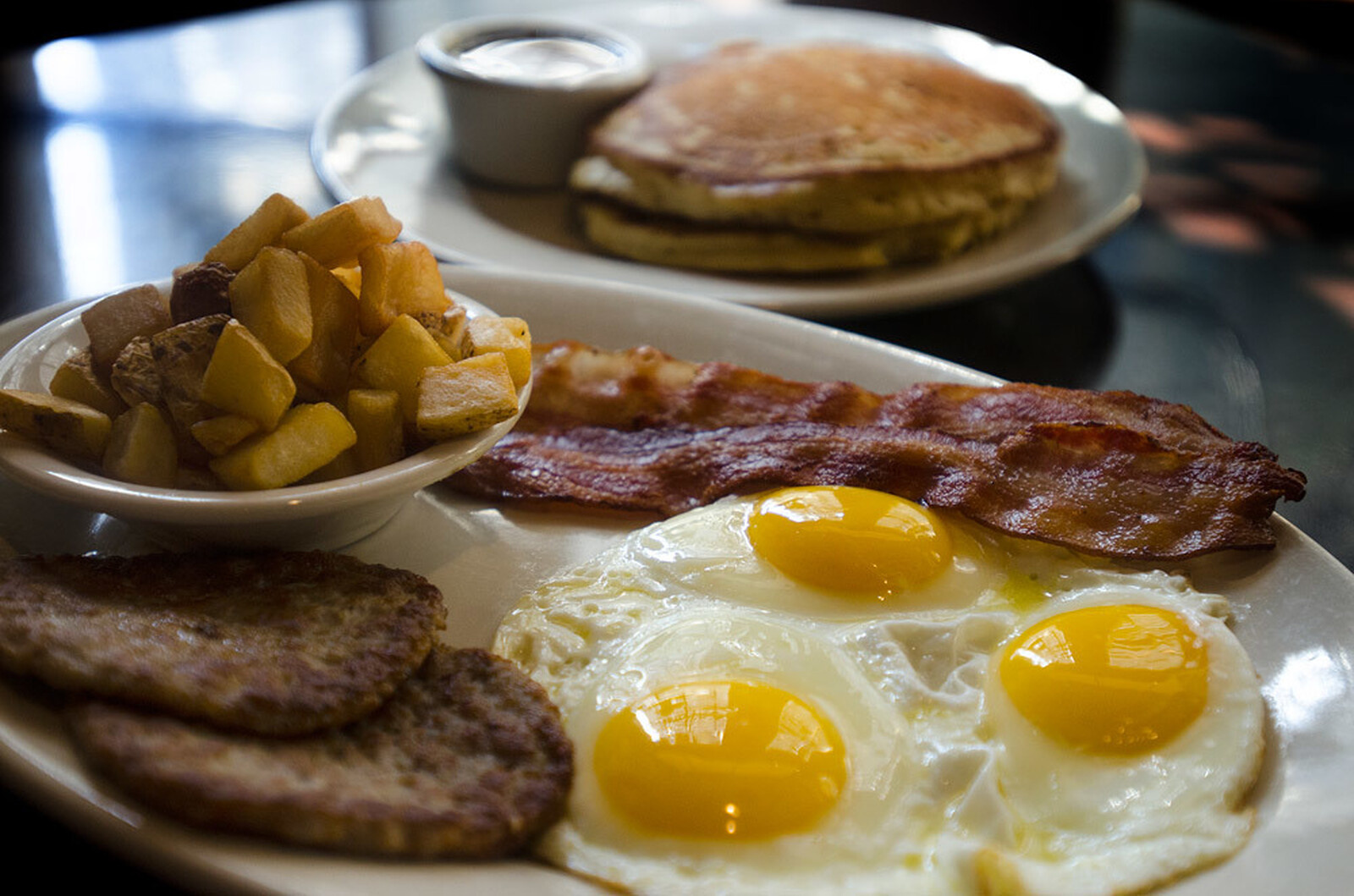 Three eggs any style, applewood-smoked bacon, sausage patties, potatoes with a buttermilk biscuit and pancakes