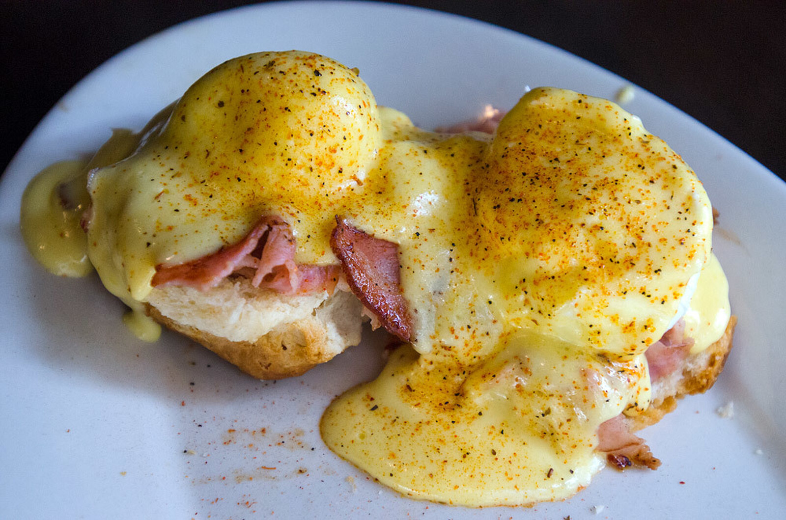 Served on a buttermilk biscuit and topped with poached eggs (no substitutions) Served with breakfast potatoes