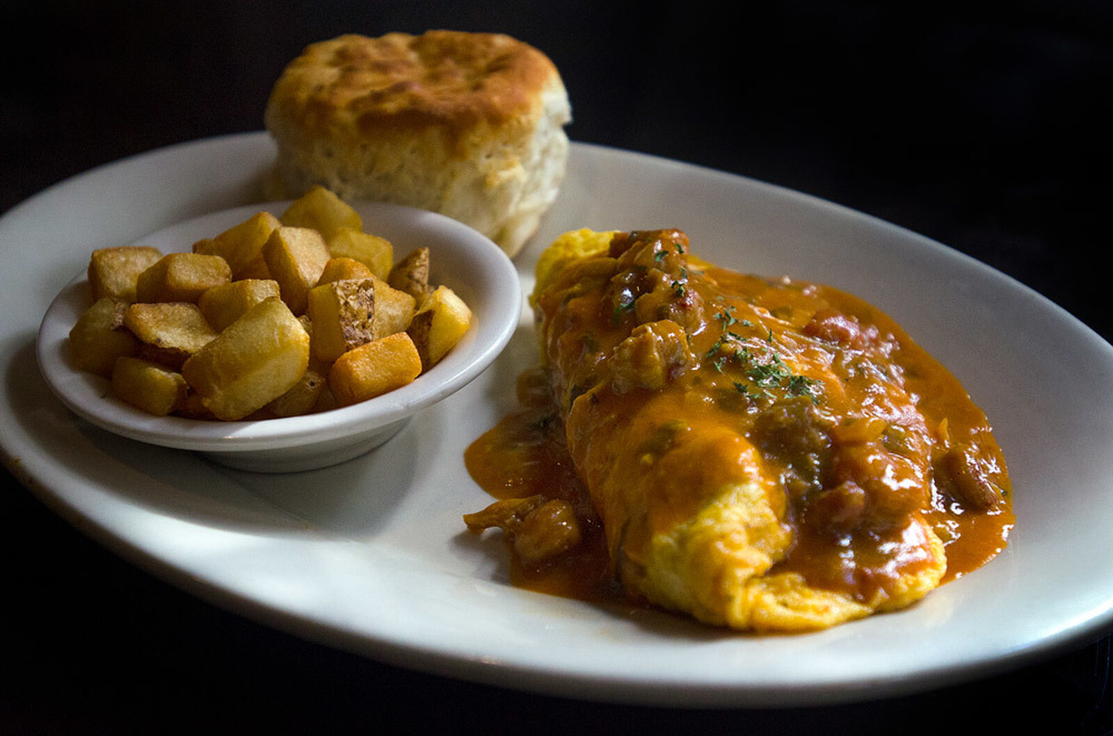 Scrambled Eggs, mixed cheese, onions, peppers, and potatoes, topped with our signature crawfish etouffee