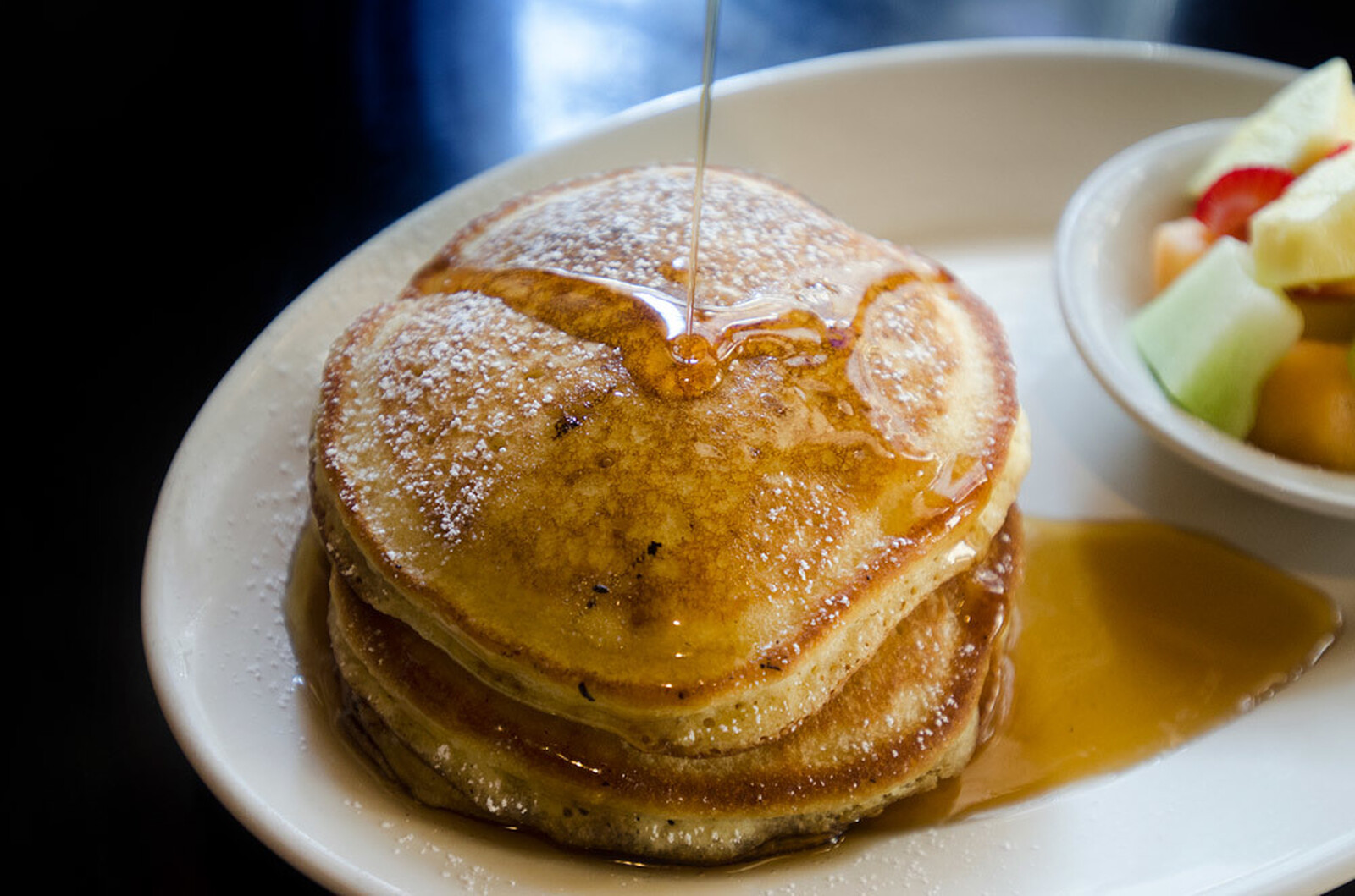 Sweet New Orleans Pancakes served with fruit, topped with powdered sugar and served with maple syrup